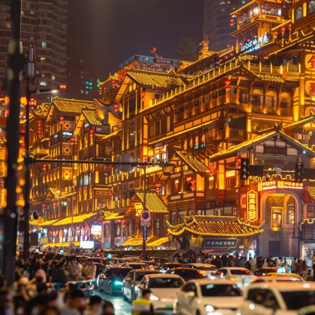 Desayuno en el hotel. Por la mañana, traslado a la estación y tren de alta velocidad a Chongqing (2 horas). Llegada a Chongqing, la ciudad mágica de “8D” de China, con más de 33 millones de habitantes. Visita al Monumento de Liberación, Edificio Kuixing, Galería del Arte (por fuera), la Plaza Chaotianmen, la Torre Riffles (sin subir). Almuerzo. Por la tarde-noche, visitamos a la Zona Hongyadong y el Puente Qiansimen para apreciar el paisaje nocturno impresionante de Chongqing. Traslado al hotel y alojamiento en Chongqing.
